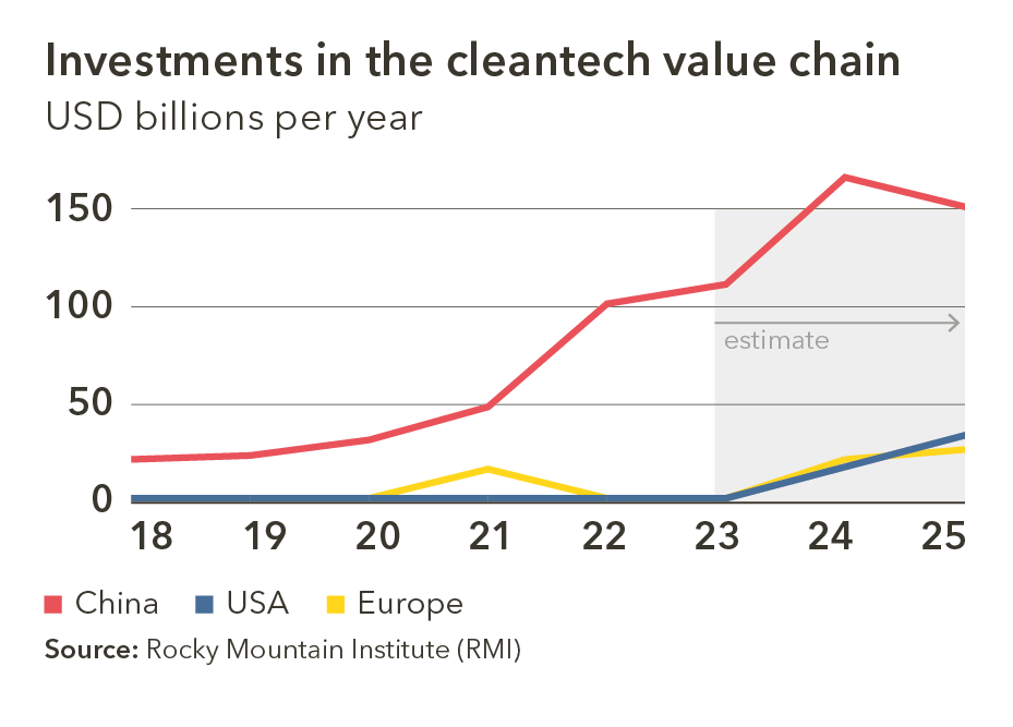 The race for the green crown has two goals: achieving independence as quickly as possible – and leading global cleantech production. China has achieved both. The country still relies on coal but also deploys cleantech on a massive scale and exports it around the world. And the United States? It is catching up slowly but surely. Its strength lies in digital solutions and specialized high-end components – both central elements for long-term leadership in cleantech.