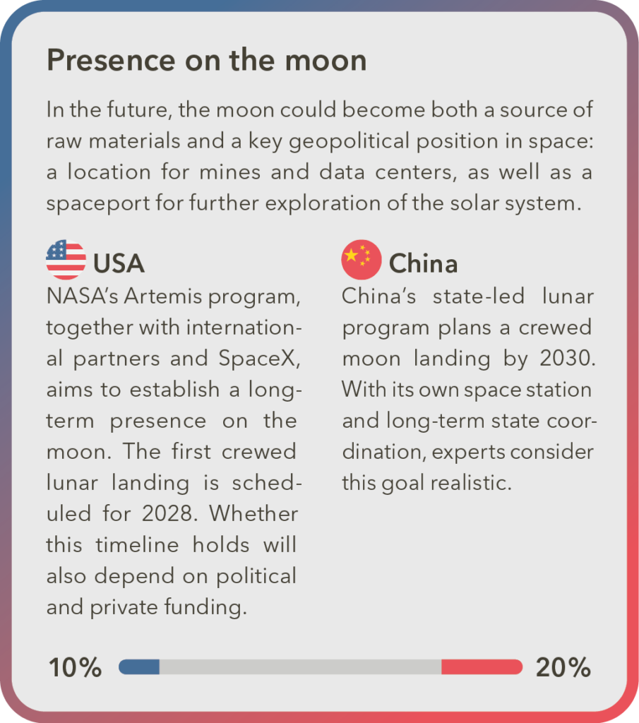 The new space race is not about symbolic flags – it is about control and influence. From rocket launches on Earth to satellite fleets in orbit and bases on the moon, the power struggle in space unfolds across three dimensions. China or the United States – who has the stronger hand?