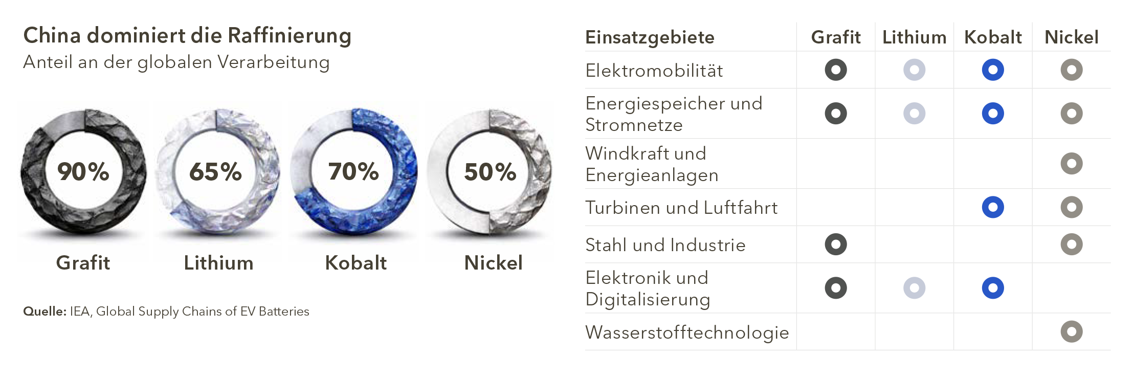 Lithium wird vor allem in Australien und in Südamerika gefördert, Kobalt überwiegend in der Demokratischen Republik Kongo, Nickel in grossen Mengen in Indonesien. Der Abbau ist an bestimmte Standorte gebunden – und politisch heikel. Neue Minen entstehen nicht im Takt von Wahlperioden. «Zwischen Entdeckung und Produktionsstart liegen oft 10 bis 15 Jahre», sagt Erismann. Weder die USA noch China kontrollieren den Zugang zu den vier Rohstoffen vollständig. Doch China hat früh Beteiligungen gesichert und langfristige Lieferbeziehungen aufgebaut. Im Boden liegt Potenzial – was daraus wird, entscheidet sich später.