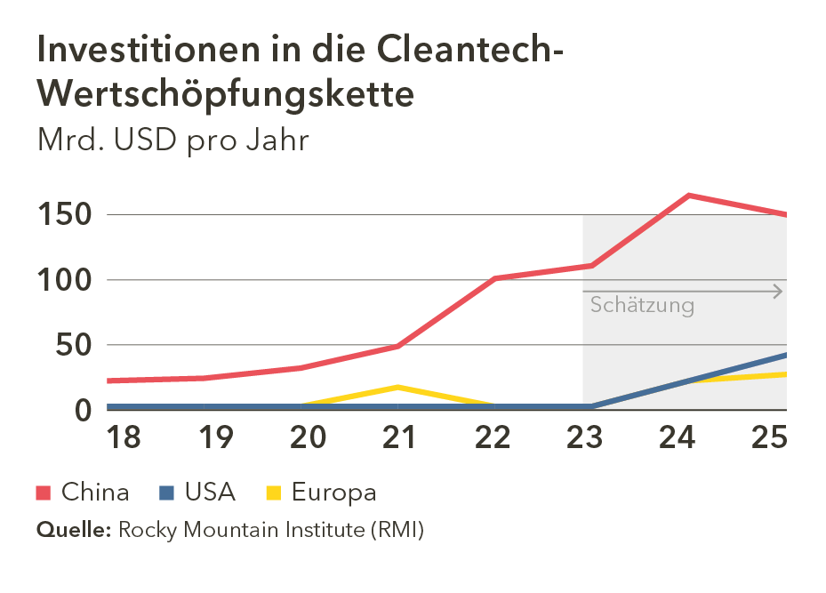 Das Rennen um die grüne Krone hat zwei Ziele: sich möglichst schnell möglichst unabhängig zu machen – und die Cleantech-Produktion weltweit anzuführen. China hat beide Ziele erreicht. Das Land nutzt zwar Kohle, aber auch Cleantech in grossem Stil und exportiert es in die ganze Welt. Und die USA? Sie holen langsam, aber sicher auf. Ihre Stärke liegt in digitalen Lösungen und spezialisierten High-End-Komponenten – beides zentrale Elemente für eine langfristige Cleantech-Führungsrolle.
